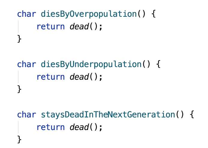3 methods have the same body, but that single line of code is used to communicate 3 different outcomes and meaning in a given (client) context.
