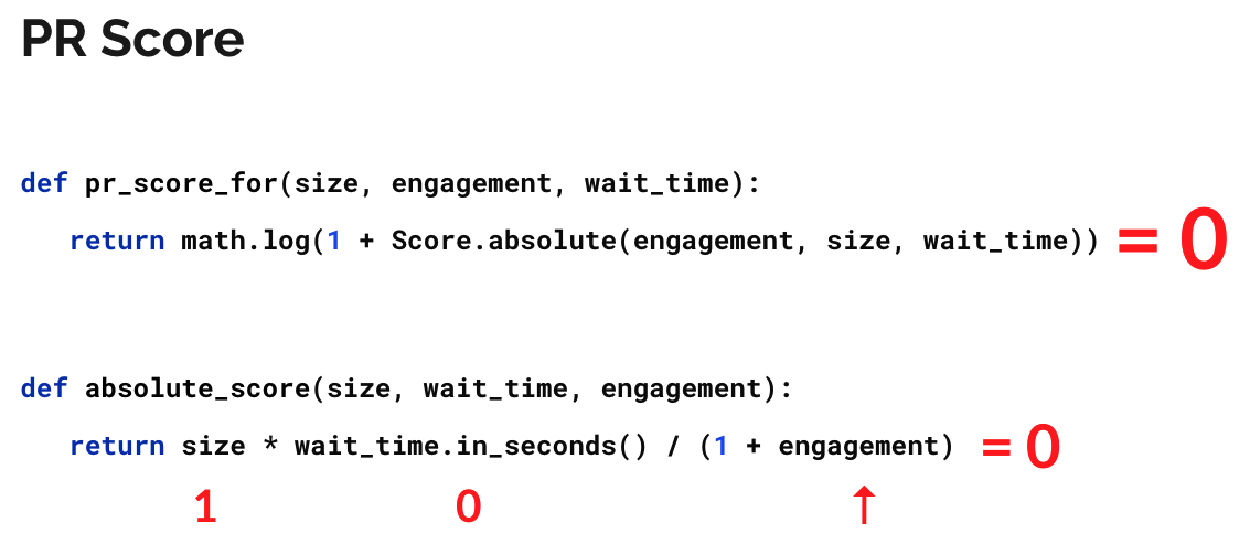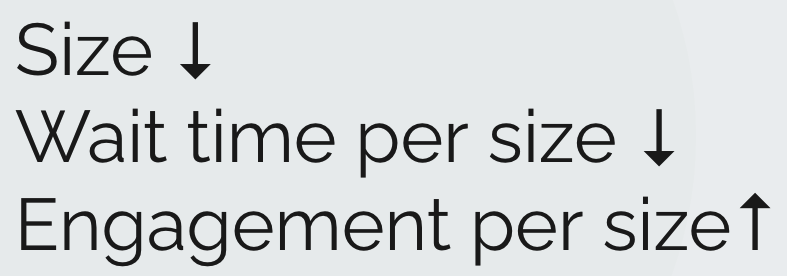 If someone is sitting next to you and is available to give you feedback immediately, the wait time per size is effectively 0 and PR size is effectively as low as 1 LoC since immediate feedback available after every LoC changed; heck, it’s even availabile after every letter typed.