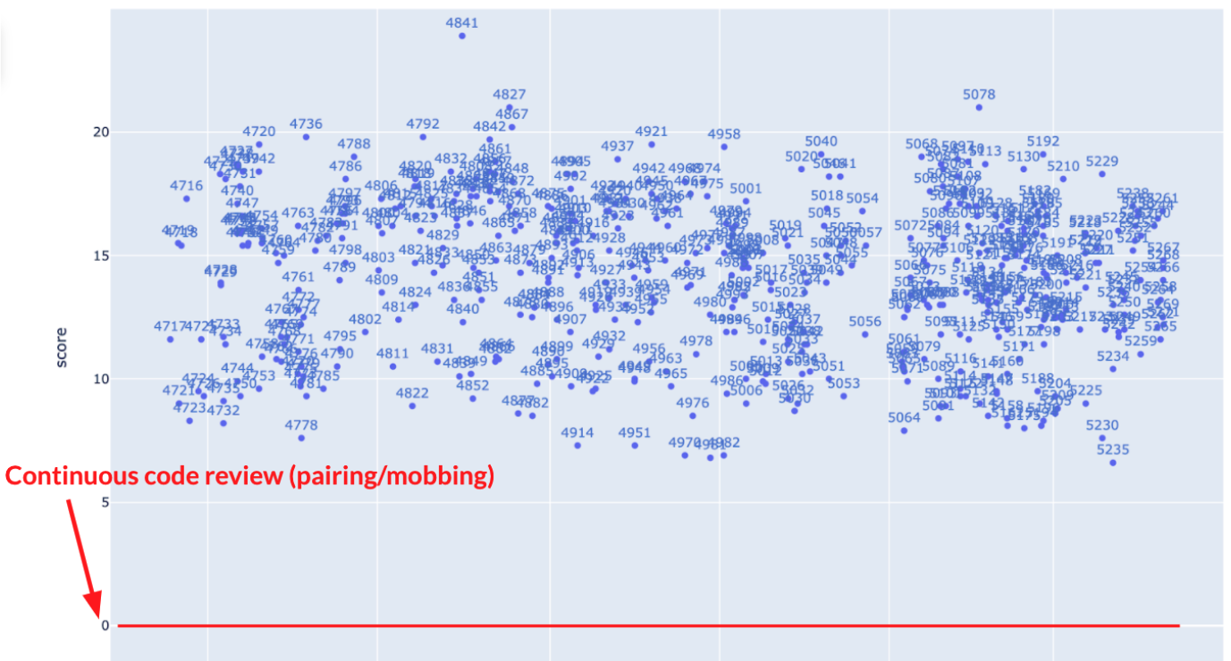 is the difference (on a natural log scale!) between the worlds of async code reviews and pairing/mobbing.